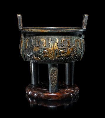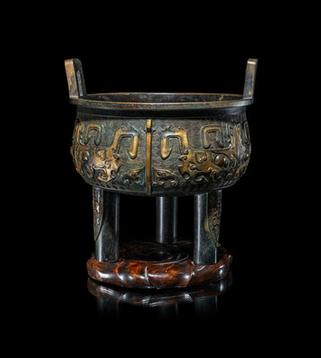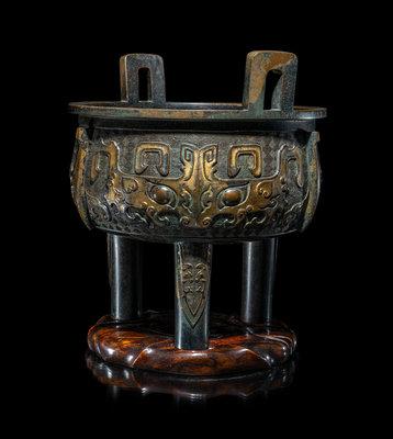 A Chinese Parcel Gilt Archaistic Bronze Bronze Ding Vessel