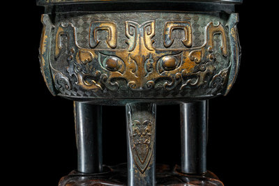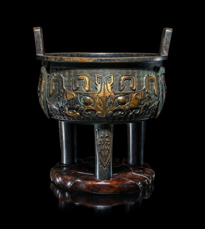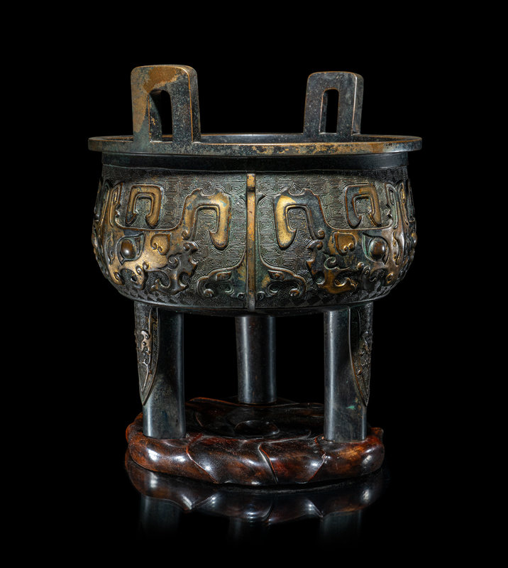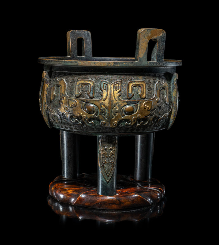 the deep, rounded body raised on three columnar supports, the main panel cast to show taotie masks alternating with raised flanges, set on a leiwen ground, above cicada blades, the upright u-shaped handles mounted on the everted mouth rim, further raised on a fitted hardwood stand.