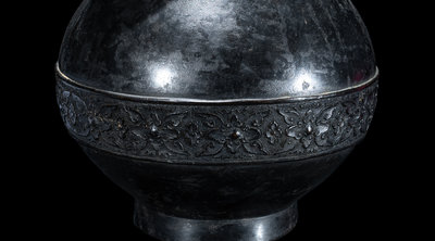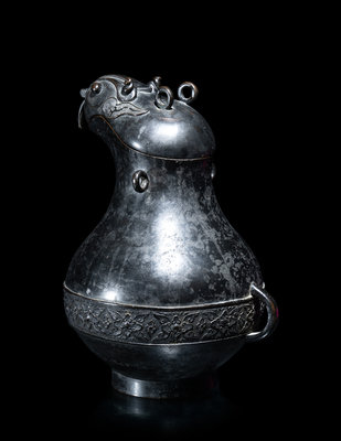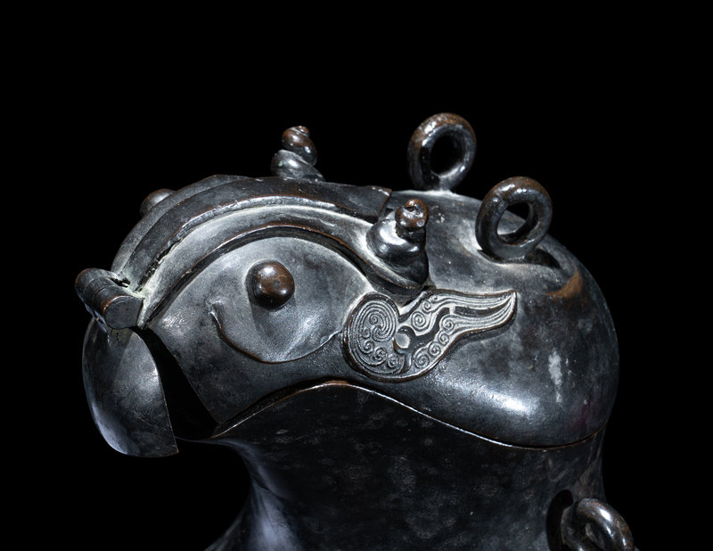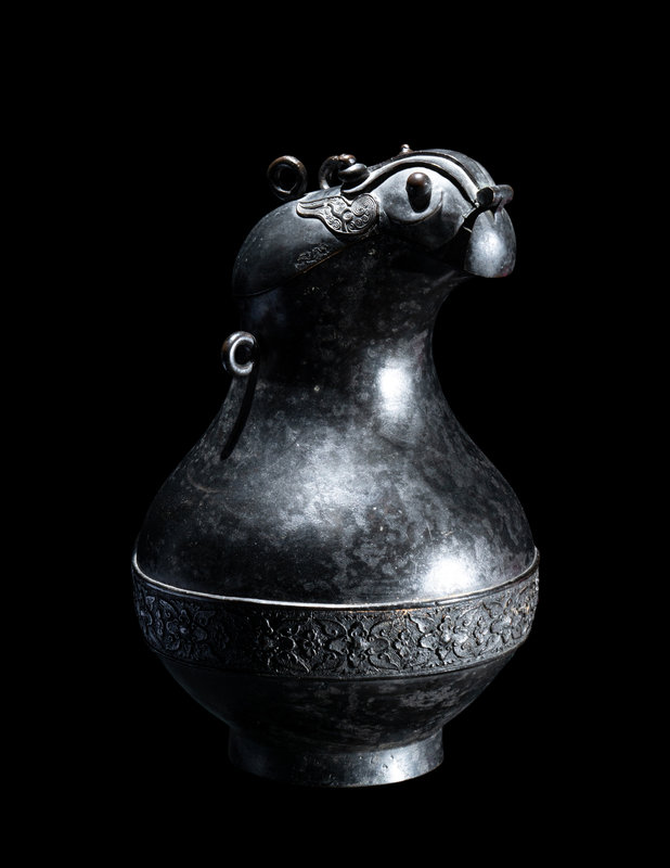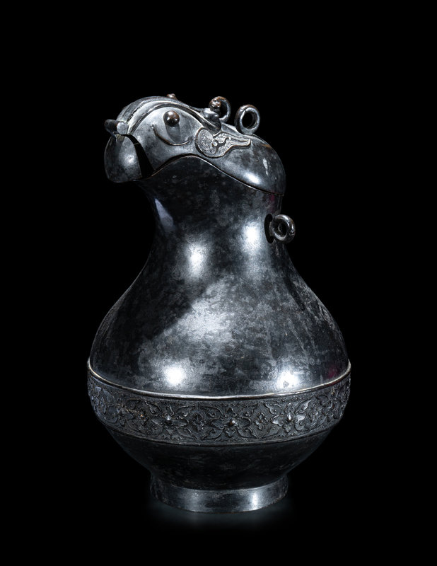 of archaic hu form, the lower section of the body cast with a floral band, the cover in the shape of an owl head with a hinged beak.