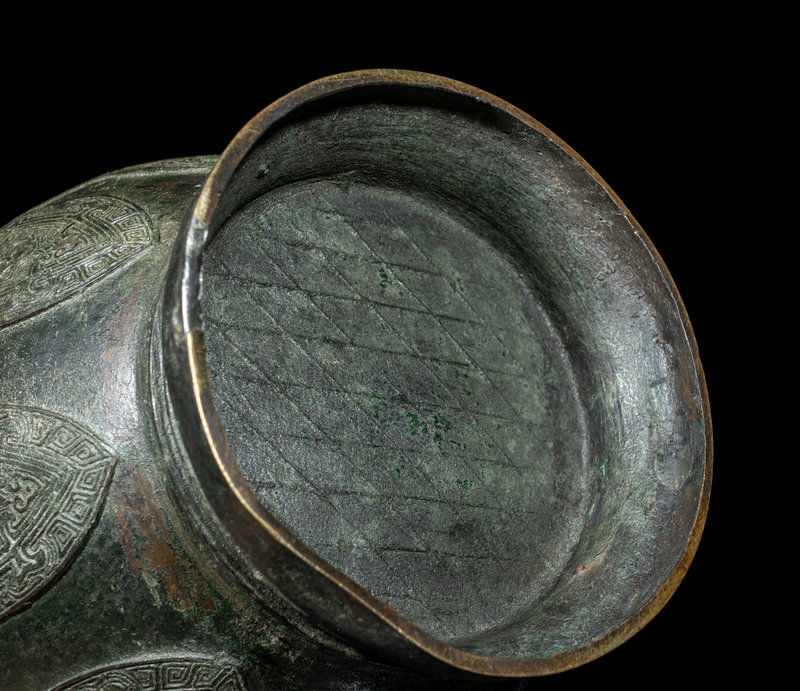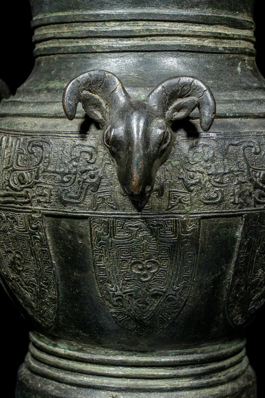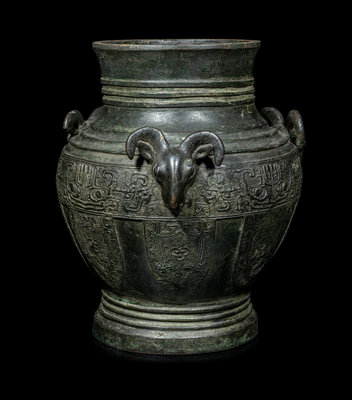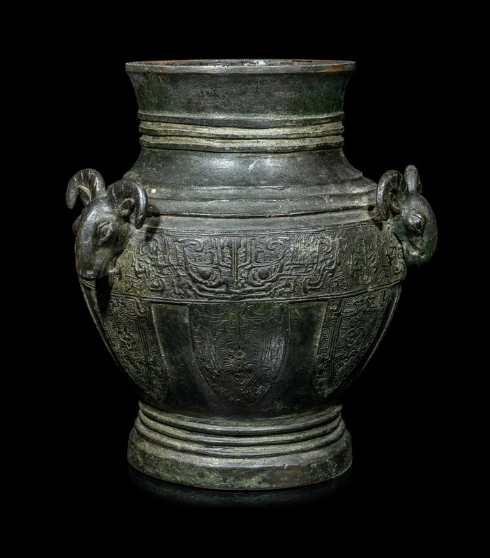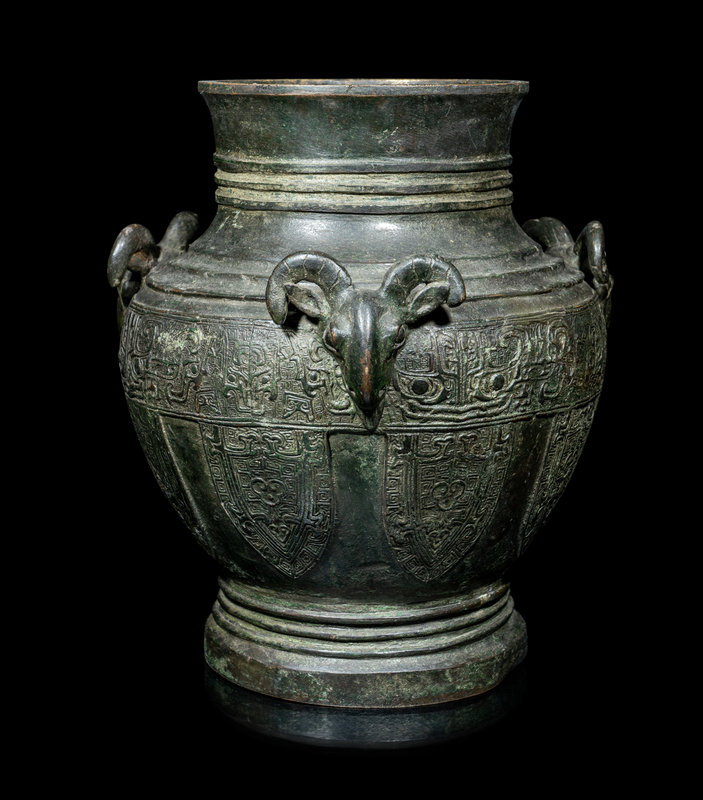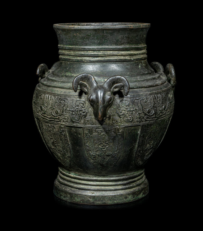 the bulbous body cast with three raised rams' heads along the shoulder, above the main panel decorated with a wide band with taotie masks and a row of blade-shaped panels enclosing archaistic motif, all between three sets of concentric rings.