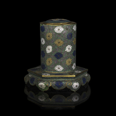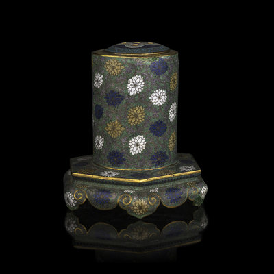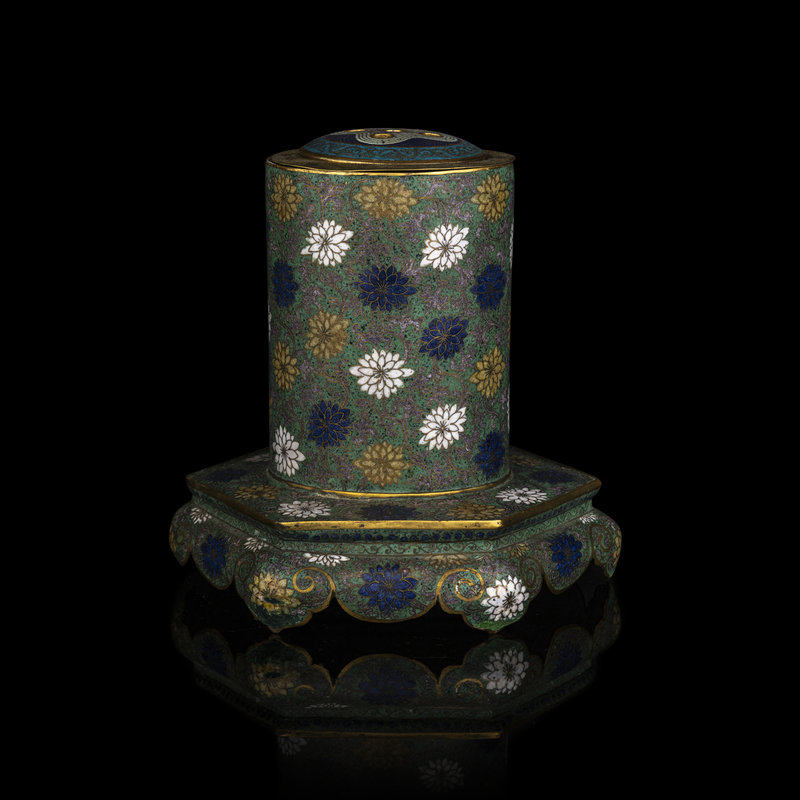 the cylindrical vessel raised on a hexagonal stand supported on ruyi head-shaped feet, the slightly domed top gilt with five small circular openings, the exterior decorated overall with chrysanthemum blossoms against a jade green ground.
