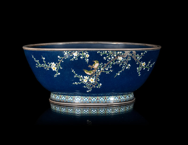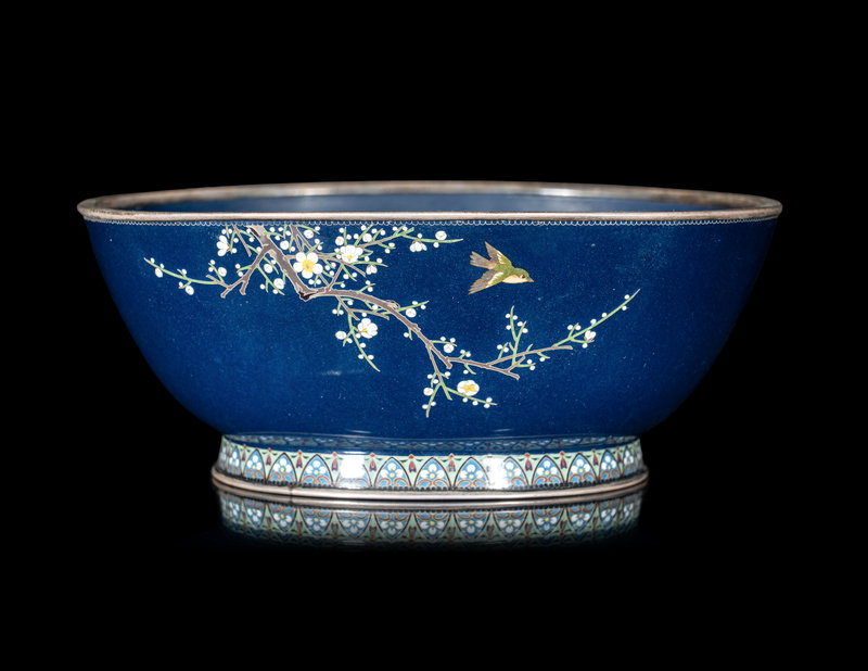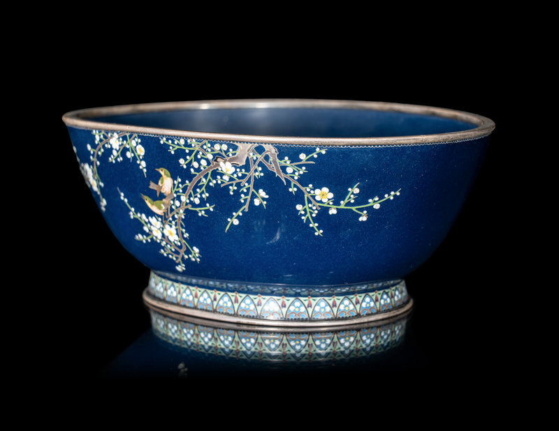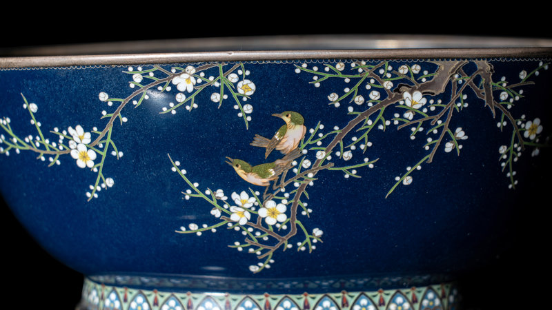 日本明治時代 稻葉七寶燒藍地櫻花雀鳥圖碗