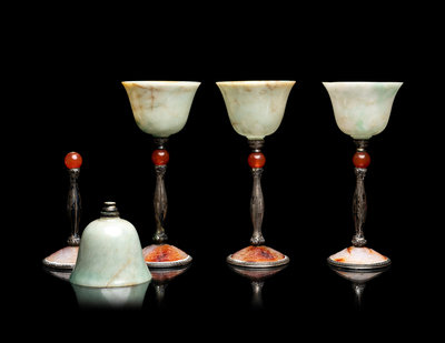 A Set of Four Chinese Jadeite, Agate and Silvered Metal Mounted Goblets