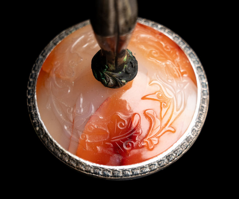each cup polished of mottled green stone with russet blushes to a bell-form with a flaring mouth rim, mounted beneath a straight footring with curvilinear silvered stems above agate-mounted bases.