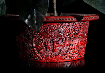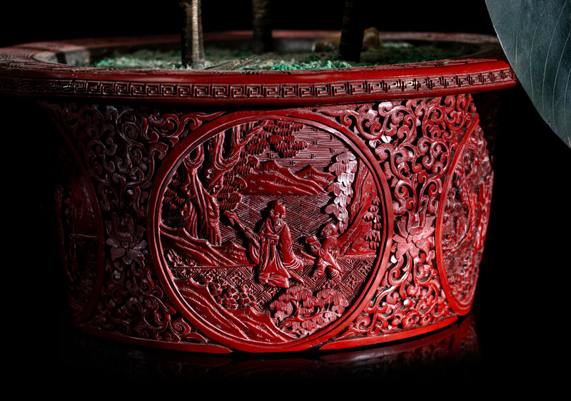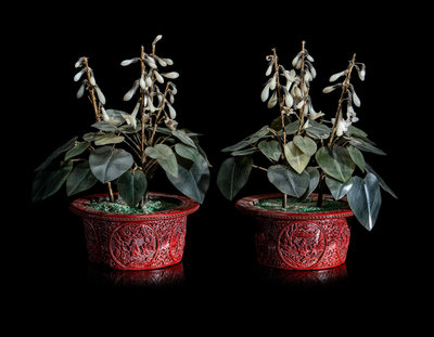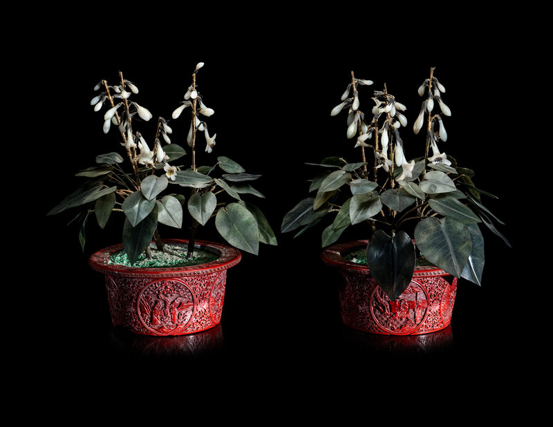 A Pair of Chinese Cinnabar Lacquer Jardinières with Jade and Hardstone Trees