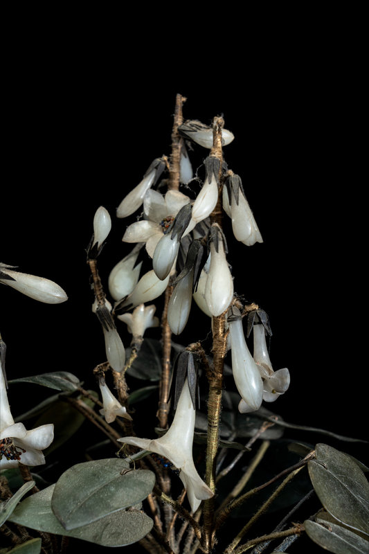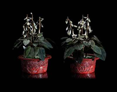 each round jardinières carved to the exterior with an ornate floral spray reserving four circular panels of figural scenes, and planted with copper wire wrapped upright stems supporting spreading leaves and cabochon blossoms.