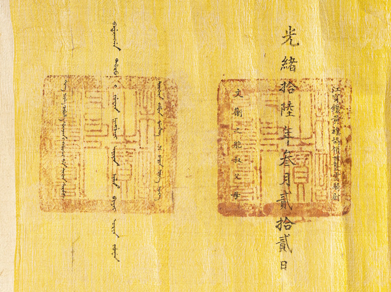 with text reading from left to right in Manchu characters and repeated from right to left in Chinese characters, the Chinese text opening with the woven characters Fengtian Chengyun (By command of Heaven) followed by in yellow ink, with two large seal impressions containing Manchu and Chinese characters.