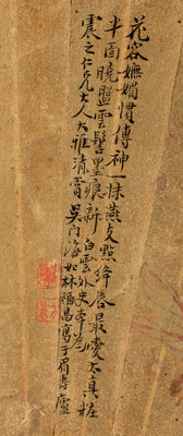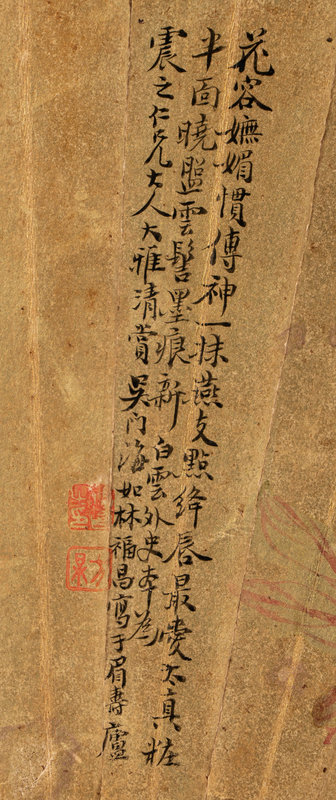 款識:花容妩媚惯传神,一抹燕支点绛唇。最爱太真妆半面,晓□云髻墨痕新。白云外史本,为震之仁兄大人大雅清赏。吴门海如林福昌写于眉寿庐。