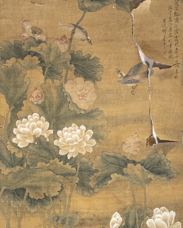 款識:藕節瑤絲翠帶長,凌波艷露不沾裳。曉來無力調朱粉。瘦畫徐妃半面妝。丙午(1666)夏六月畫于重香閣。毗陵惲壽平。