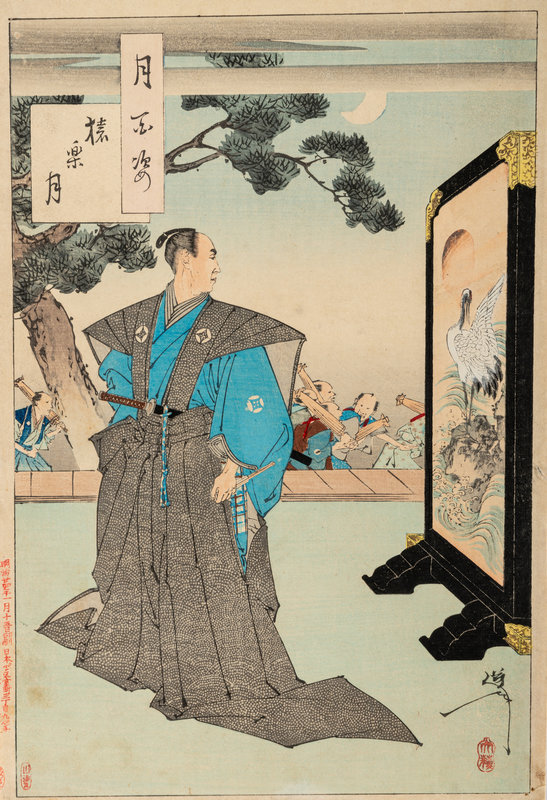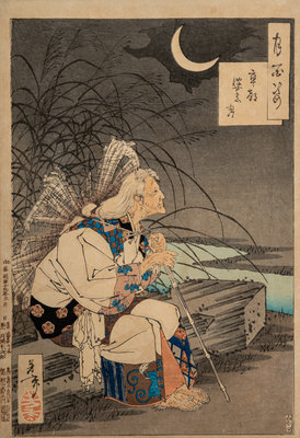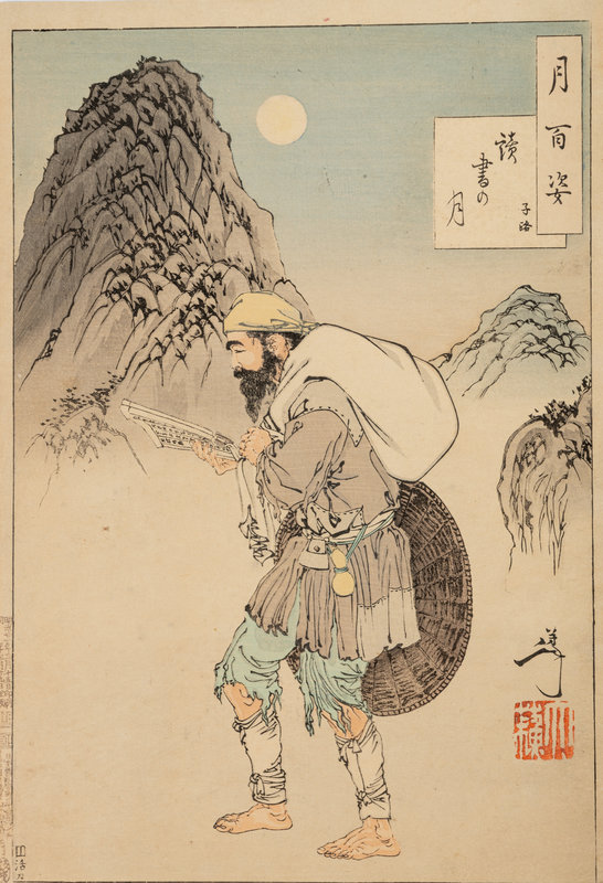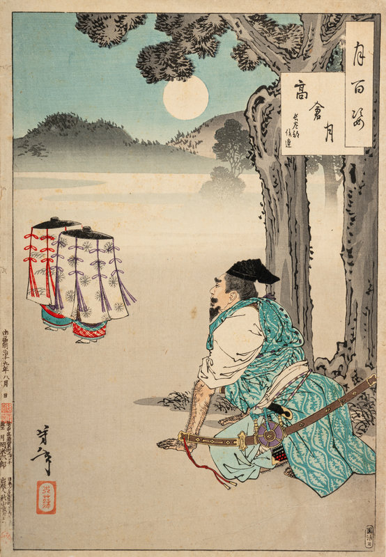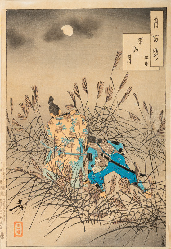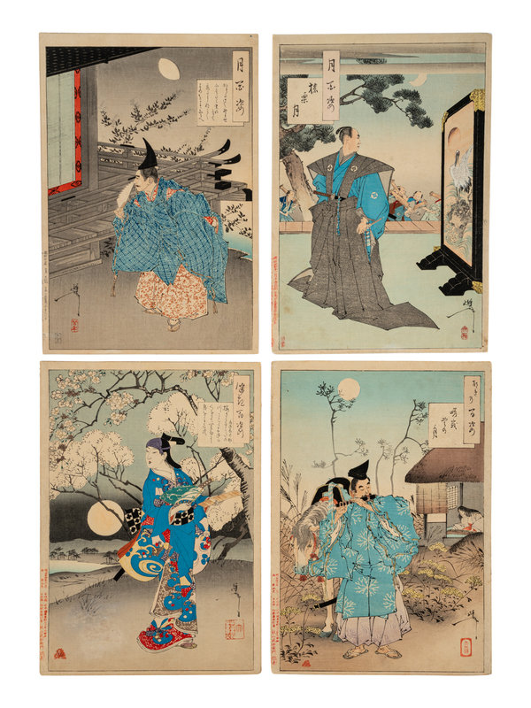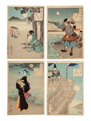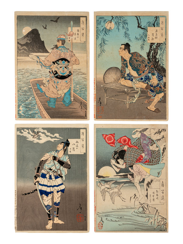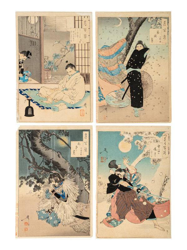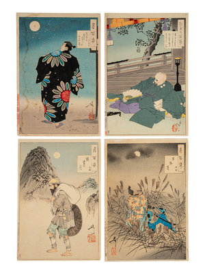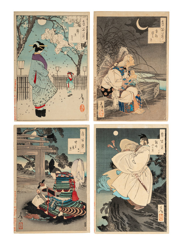 24 colored Oban tate-e wood block prints from the series Tsuki hyakushi (One hundred aspects of the moon)