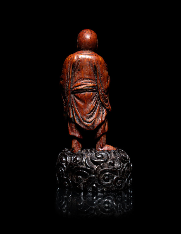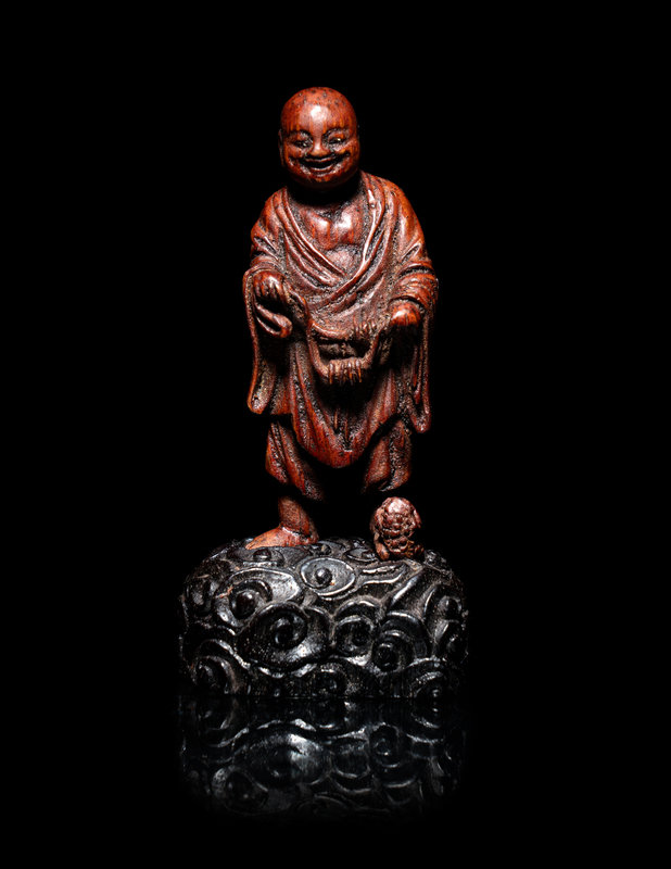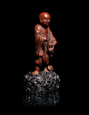 the immortal figure depicted standing, dressed in loose robes and holding a long strand of money in both hands, resting on a hardwood stand carved to show clusters of clouds.
