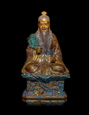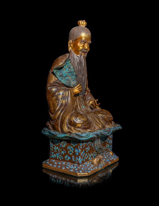 the figure depicted seated with crossed legs on a raised rectangular pedestal, dressed in voluminous robes decorated with shou medallions, his right hand raised holding a fan, and the left hand lowered, his face carved to show a subtle smile with bushy eyebrows and long beard, all hair pull to a top knot secured by a lotus bud-form crown.