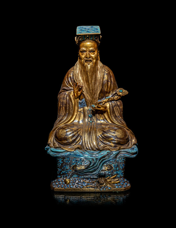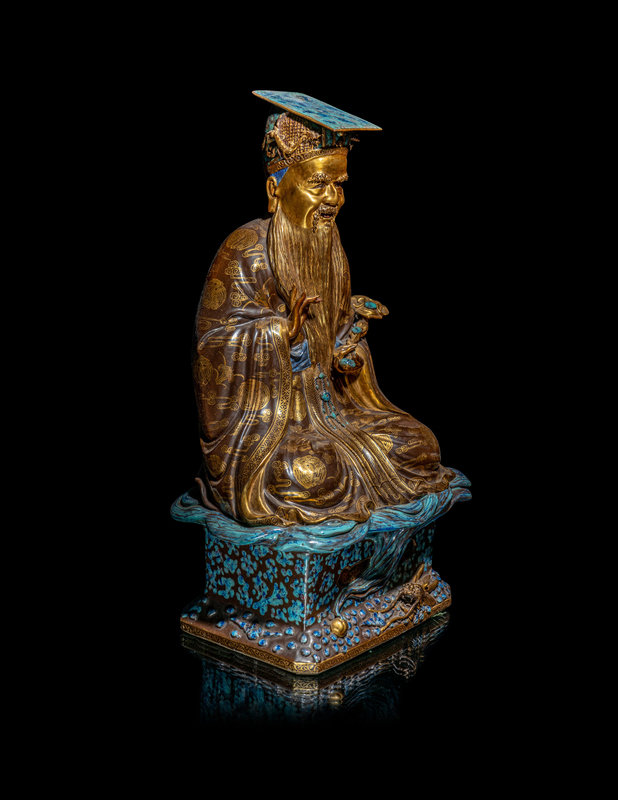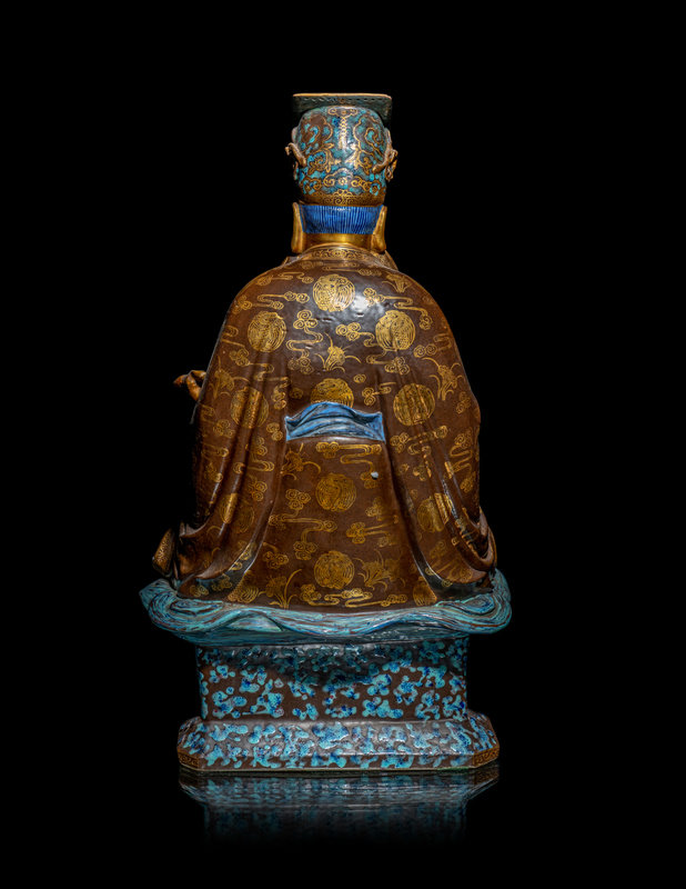 the figure depicted seated with crossed legs on a raised rectangular pedestal, dressed in voluminous robes decorated with phoenix roundels amongst flowering plants and auspicious clouds, his right hand raised the left hand lowered, holding a ruyi scepter, his face carved to show a subtle smile with bushy eyebrows and long beard, underneath a tall elaborate hat.