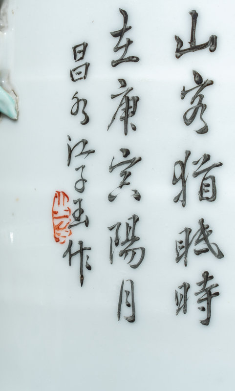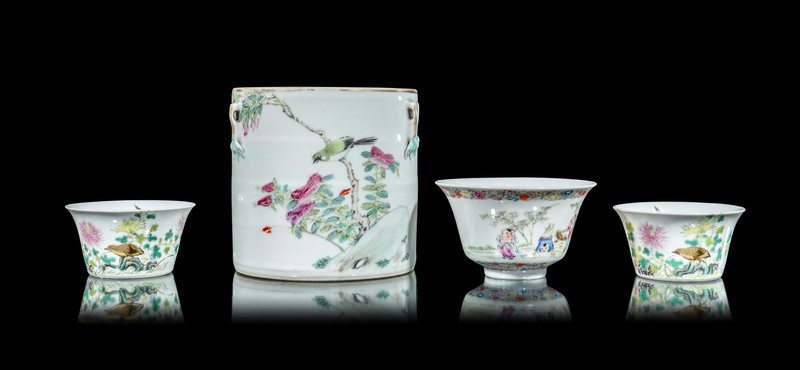 comprising a jar with four pierced handles, decorated to the exterior with a bird and flower scene opposite verse, a tea bowl decorated to the flaring walls with boys at play between millefleur bands, and a pair of 'chrysanthemum and quail' wine cups.