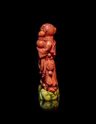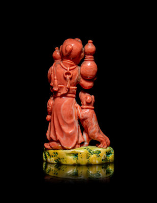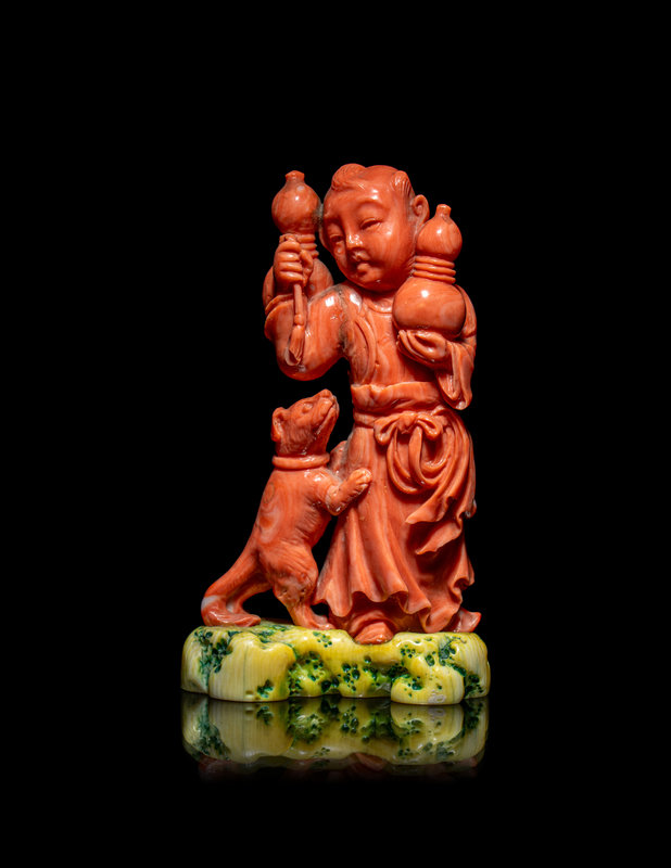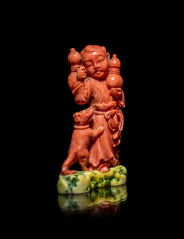 the boy figure carved standing, wearing loose robes, each hand holding a large gourd, a playful dog climbing onto him.