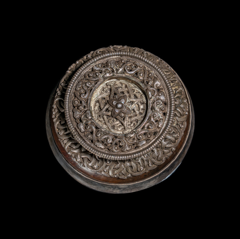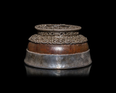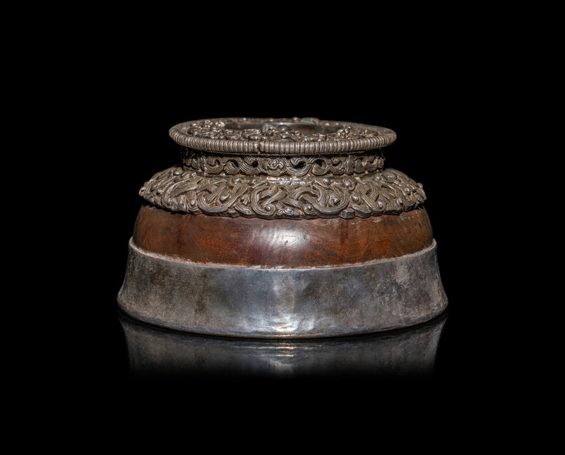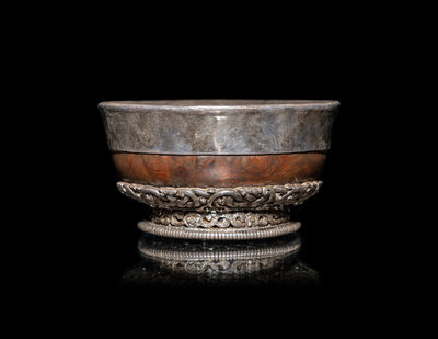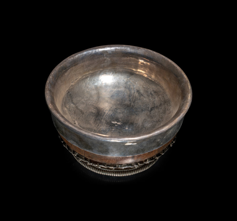 supported on a short stem foot and rising to an everted rim, with silver-washed interior metal lining, the exteriors with repoussé bands of foliage.