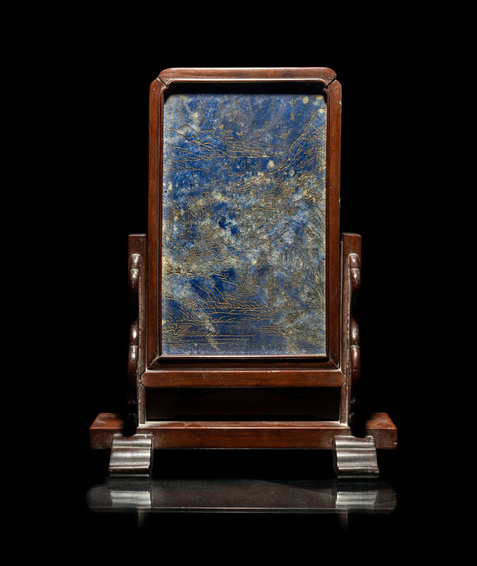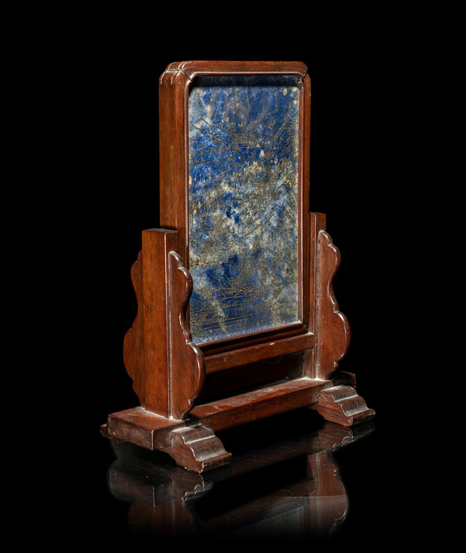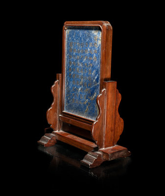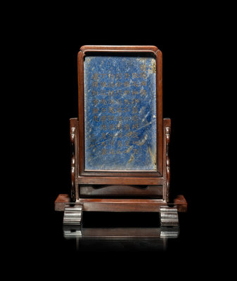A Chinese Incised and Gilt Highlighted Lapis Lazuli Table Screen