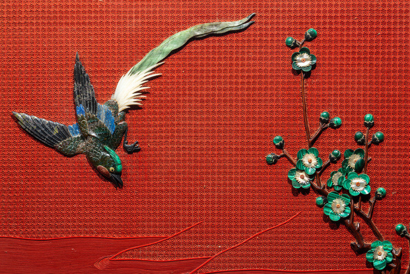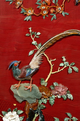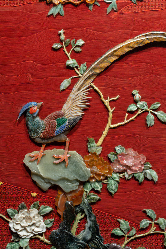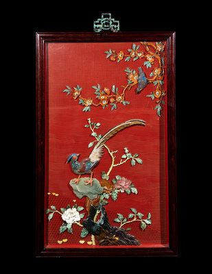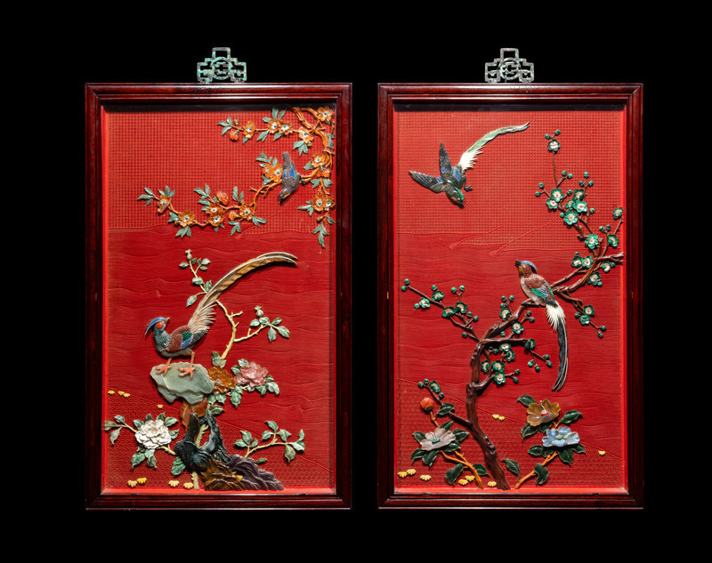A Pair of Chinese Cinnabar Lacquered Ground Hardstone Inlaid Hanging Screens