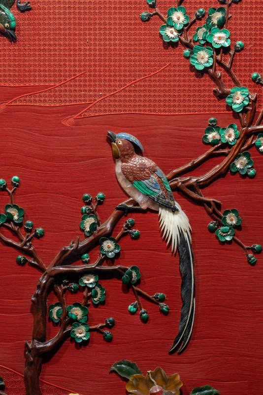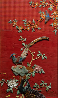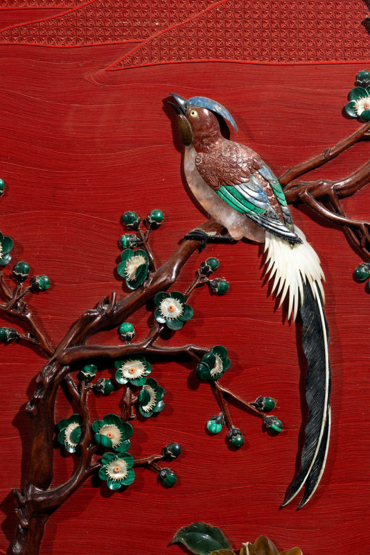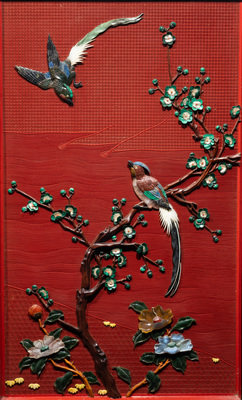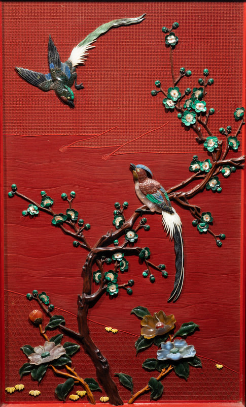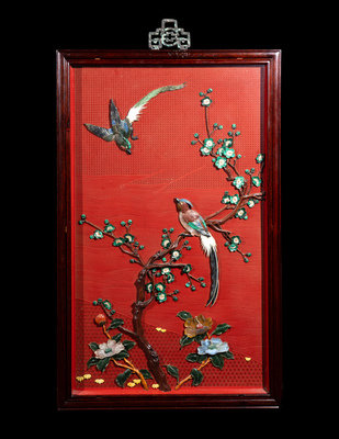 近代 剔紅地嵌百寶花鳥圖挂屏一對