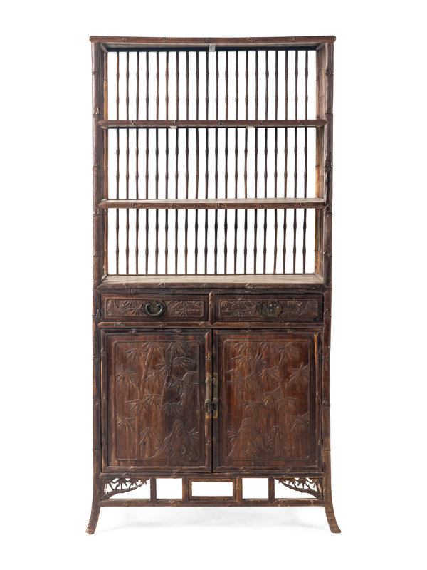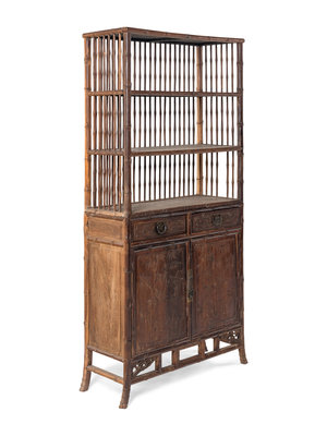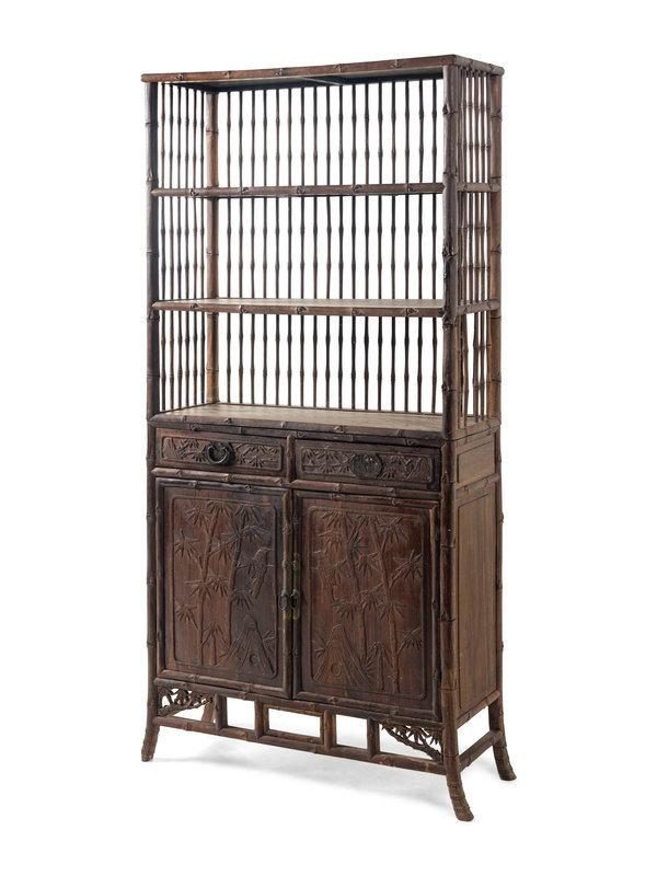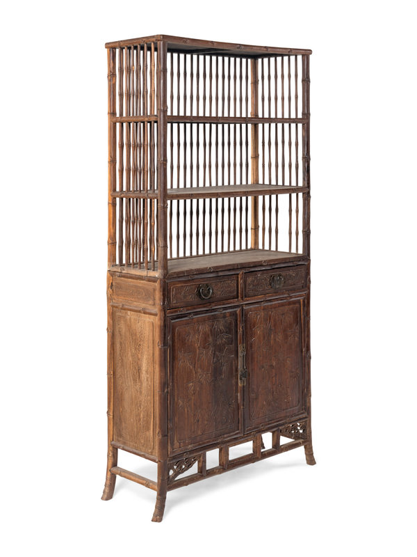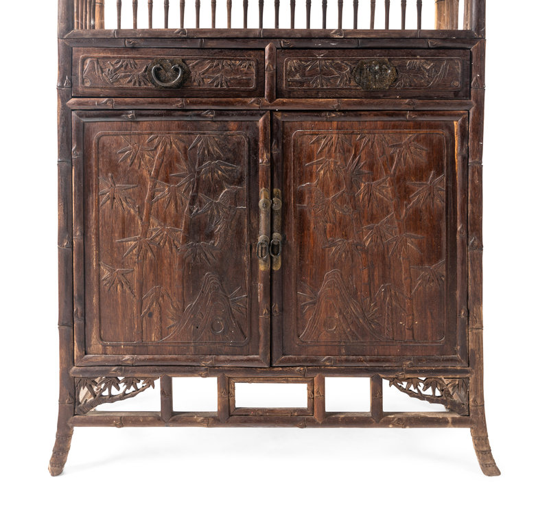 the rectangular cabinet decorated overall with bamboo motif, comprising three open shelves above two drawers and a pair of pull-out doors opening to reveal the interior drawer, the spreading legs joined by openworked aprons.