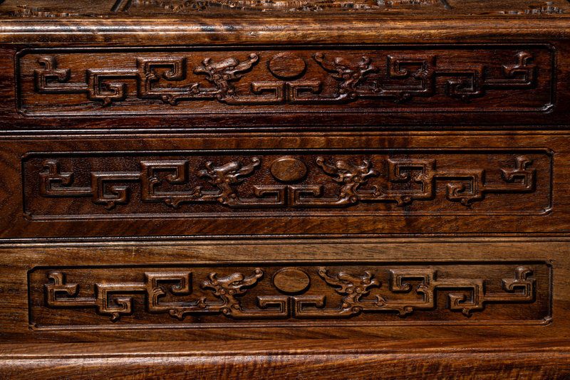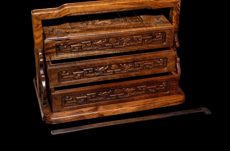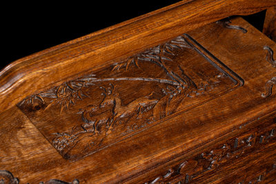 the two removable trays set into the base stretcher frame fitted with upright struts flanked by openwork spandrels at the sides, the struts joined on top by a humpback handle, the top covered centered with a rectangular panel, carved to show two running deer underneath pine trees, enclosed by four winged bats on the corners, the sides decorated with low-relief carved panels with a pair of striding dragons chasing the pearl of wisdom, the wood of attractive color and grain.