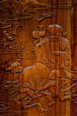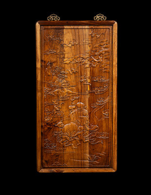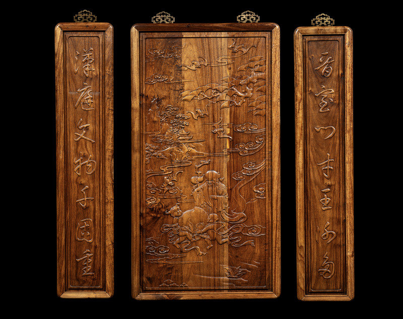 each rectangular panel set in a rounded frame, the largest panel carved in relief depicting the immortal of longevity, Shoulao, following two children carrying a large peach, underneath a pavilion resting atop a small mountain amongst auspicious clouds and flying bats, all above pine trees, further clouds and bats; the two smaller couplet panels carved with inscriptions; the wood of attractive grain.
