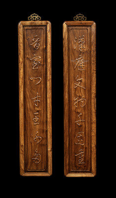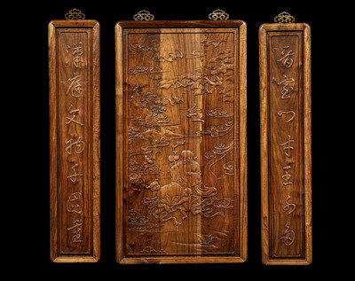 A Set of Three Chinese Huanghuali Couplet Wall Panels