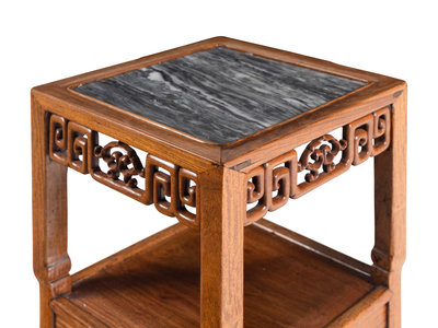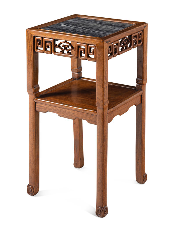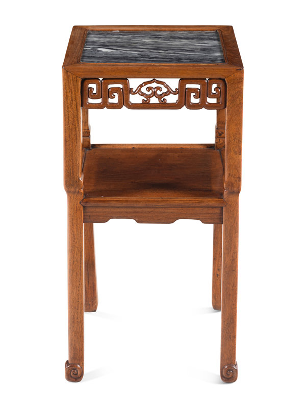the square marble panel set within a thick frame, supported by pieced and carved aprons depicting central ruyi heads enclosed by keyfrets, the curved, slender legs joined by a lower square shelf above shaped aprons, terminating in hoof feet.