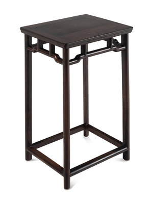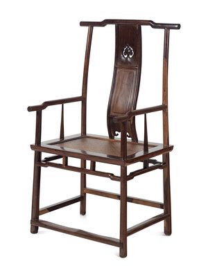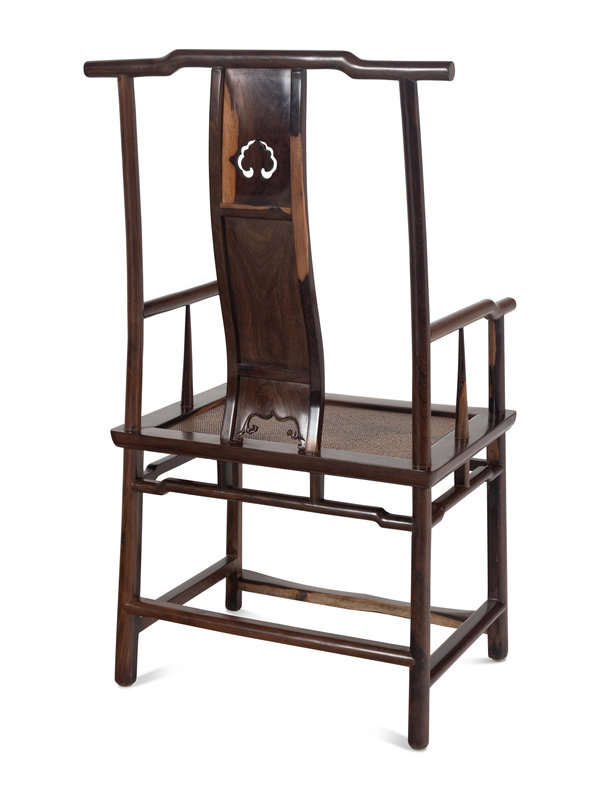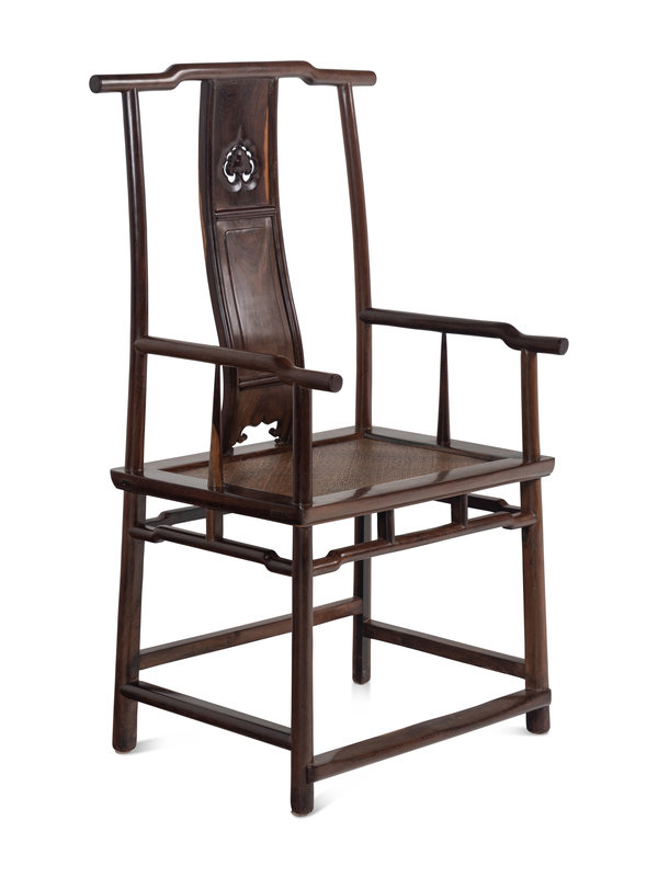 each with humped back crest rail supported on continuous posts form the rear legs, the S-shaped, slightly splayed splats divided into three sections, the uppermost with an openwork ruyi-shaped panel, centered by another plain rectangular panel, above a beaded, shaped apron, the curved arm rails supported by straight stiles and posts, the mat seat set within a rectangular frame, above plain, strutted aprons, all resting on cylindrical legs joined by stepped stretchers and the footrest; together with a later rectangular side stand.
