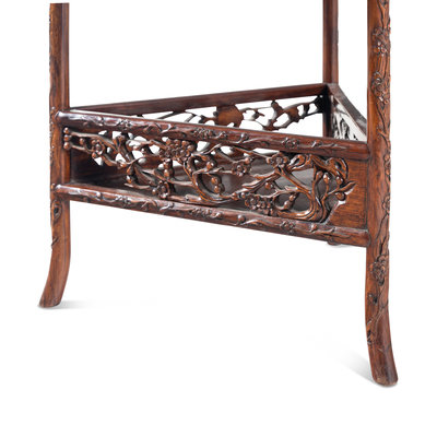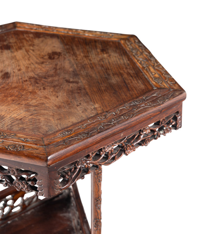 the hexagonal top panel set in a thick frame, carved in low relief showing prunus blossoms continuing onto the reticulated aprons and legs, all above a triangular shelve enclosed by three openworked panels and three flaring feet.