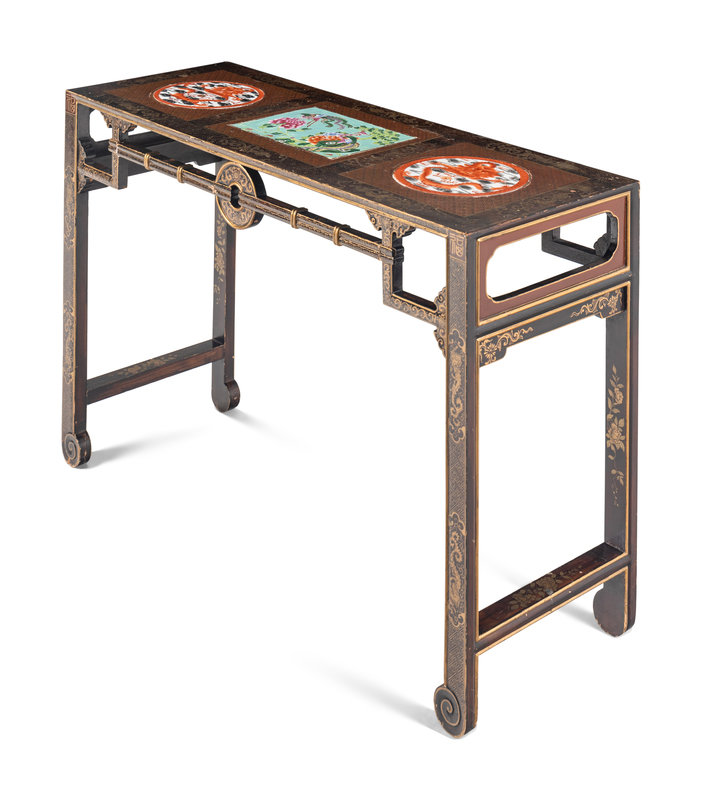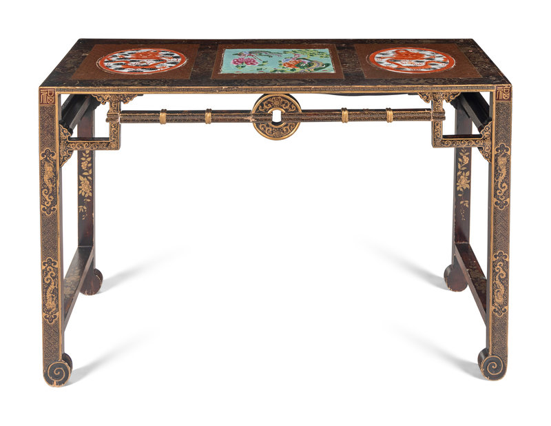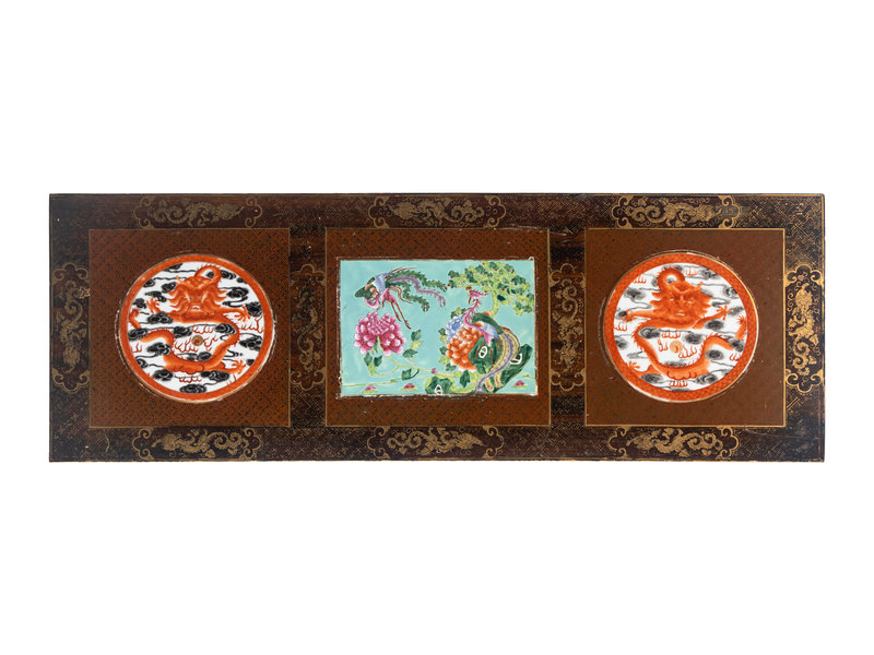 the rectangular top divided into three sections, each inset with a porcelain panel against a diaper ground, two panels painted with iron red enameled sinuous dragons amongst clouds, and one panel showing phoenix birds amongst flowering peonies; all bordered with striding dragons flanked by ruyi heads, set above background with interlocking T's; the openwork aprons decorated on each side with twisted robes suspending a bi disc, gilt highlighted dragon decoration continued on the rectangular section legs joined by stretchers at the sides, ending in hoof feet.