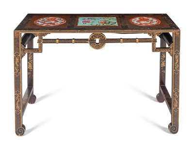 A Chinese Porcelain Inset Gilt Highlighted Black and Brown Lacquered Wood Side Table, Tiaozhuo