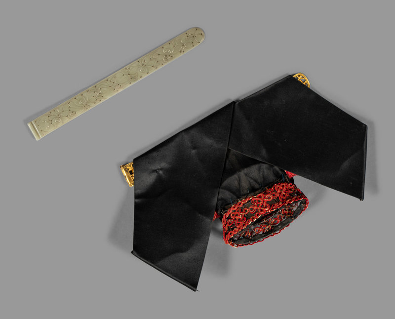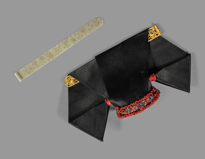 the eight-sided headpiece fashioned of black silk satin arranged to simulated elegantly coiffed hair folded over a gilt metal openwork crosspiece above a red silk band of knots punctuated with beaded flowers, together with an additional crosspiece of pale celadon jade incised with floral motifs.