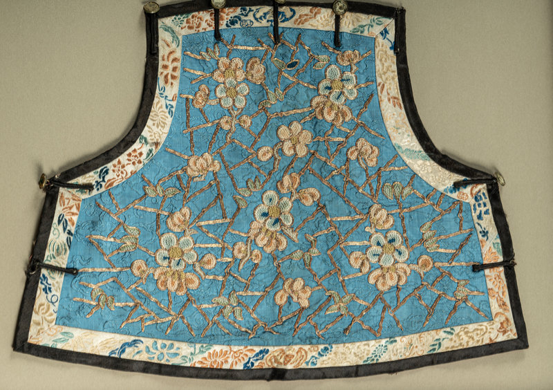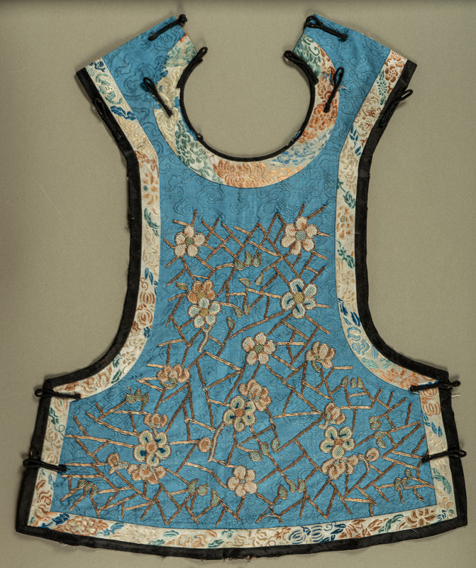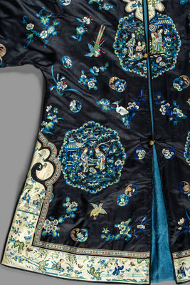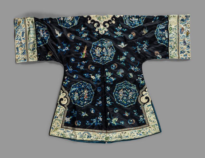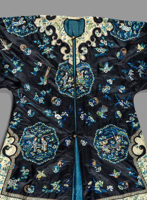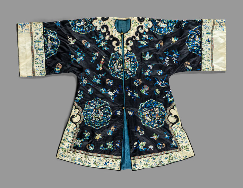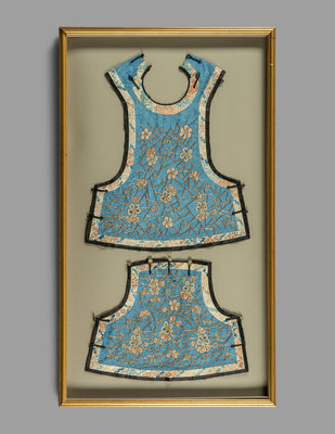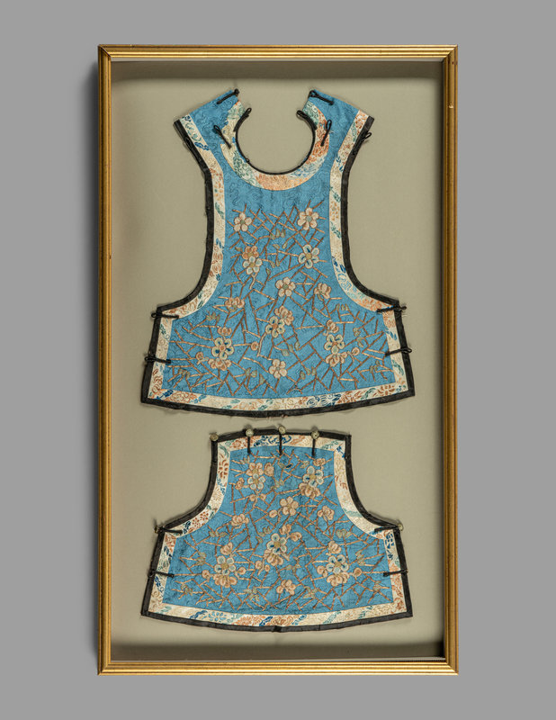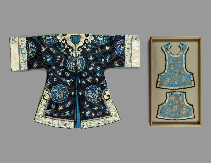 comprising a two piece vest, worked to the pale blue ground with a network of couched gilt threads organized suggesting a cracked ice pattern of prunus branches supported polychrome flower heads worked in taut knotted stitches, all trimmed in white ground borders piped black, affixed with buttons and tassels, each section mounted within a frame. The second a blue ground overcoat worked overall in a palette of 'three blues' with twelve octagonal roundels depicting figural scenes reserved by puffy clouds against a ground of butterflies and birds soaring amidst floral sprays. Centrally organized with an ornate cream ground 'cloud collar', shaped vents, and wide cuffs.
