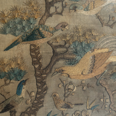 the lacquered frame decorated with gilt bamboo set with a busk satin embroidered with pale gold, turquoise, and ochre floss to show a profusion of birds roosting amidst flowering prunus, pine, peony, and rockery. The whole mounted against a plain blue silk, and framed.