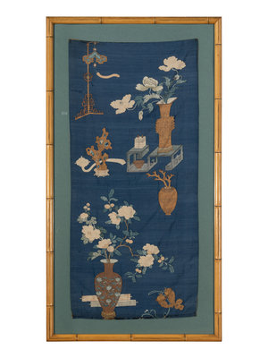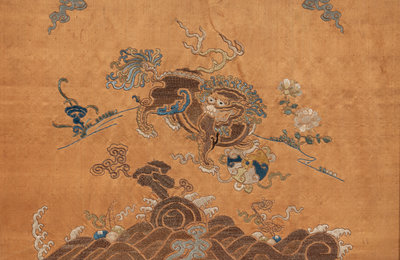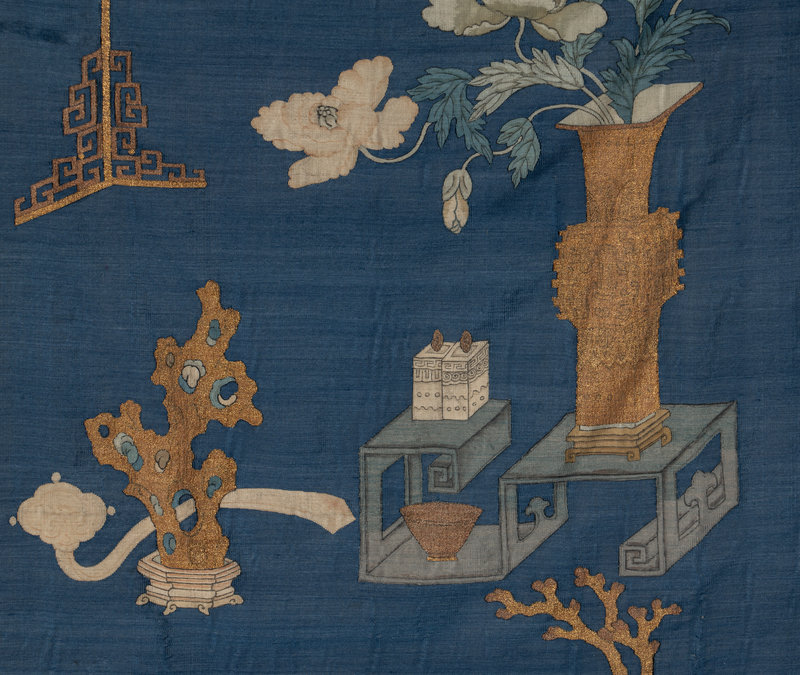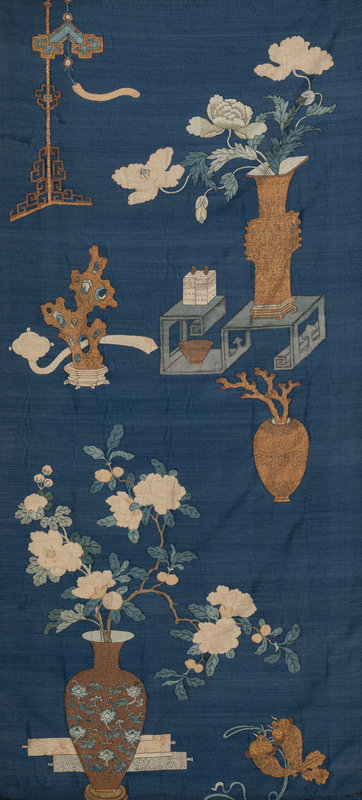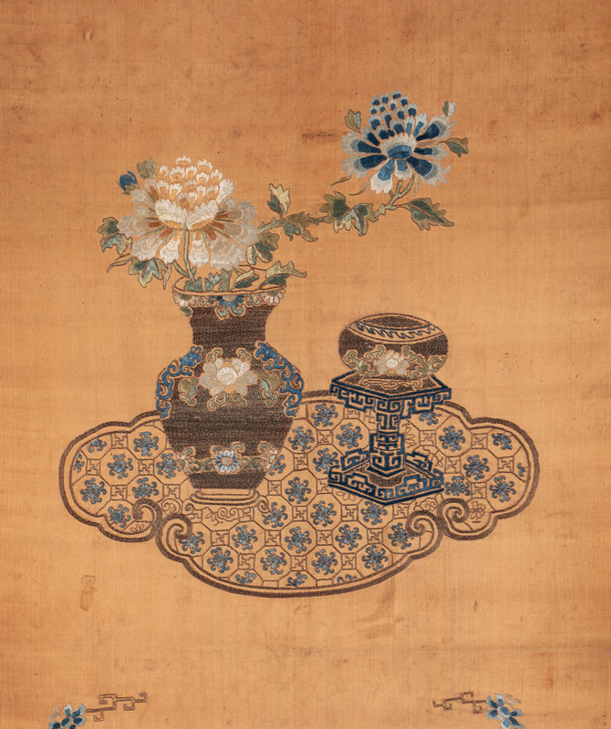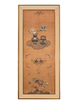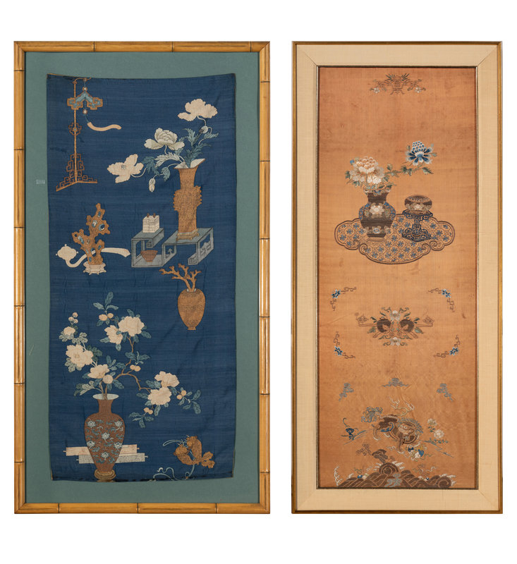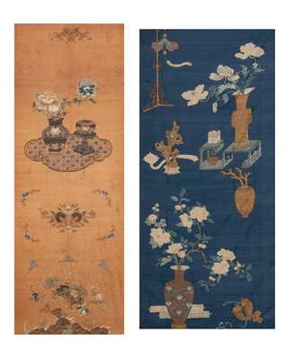 comprising a large apricot ground example couched with gilt metallic threads and polychrome floss with a vertically organized composition of peonies presented in ornate vessels, paired peaches, and a mythical beast at play in crashing waves. The second kesi woven panel worked with close gilt threads with a similar motif of scholarly accoutrement spread across a lake blue ground.