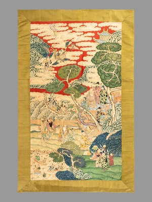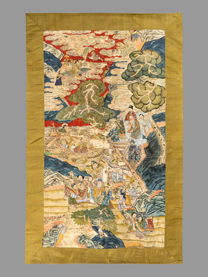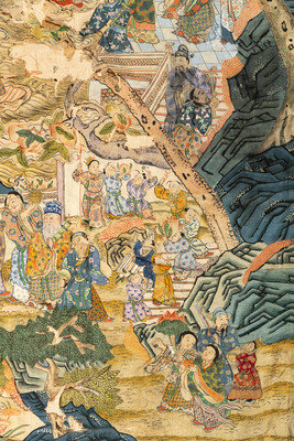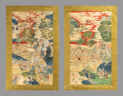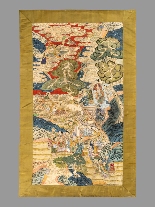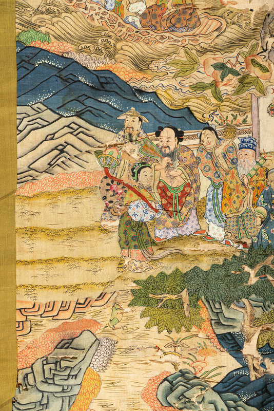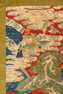 each woven and richly detailed with ink and pigments to depict a scene of Daoist immortals and deities in a fantastic landscape with curling pines and wispy clouds, mounted within plainly woven green silk.