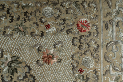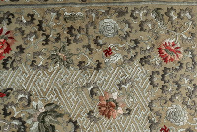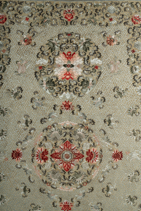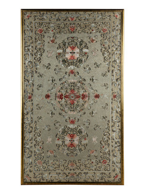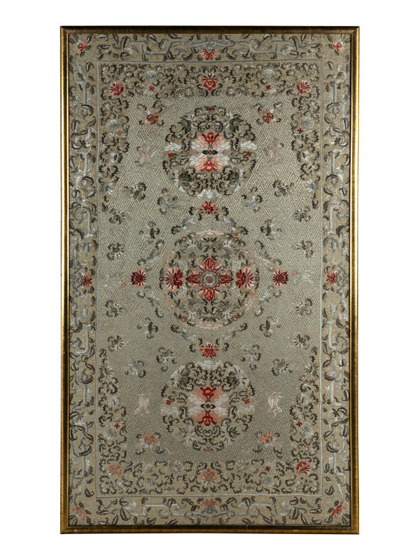 of rectangular section, woven of a sage green ground and embroidered with silver, pink, a green floss in satin stitches with three central lotus medallions against a ground of angular lozenges with floral heads and auspicious symbols, further surrounded by lotus scrolls to complete the rectangular reserved bordered by an archaistic meander with acanthus leaves; gilt hardwood frame.