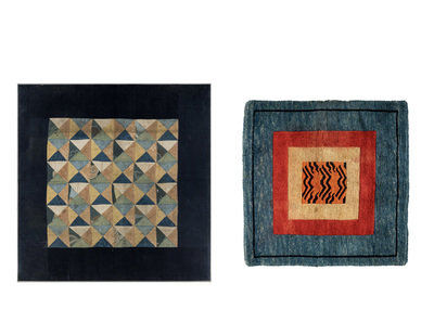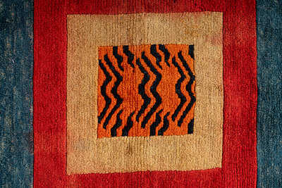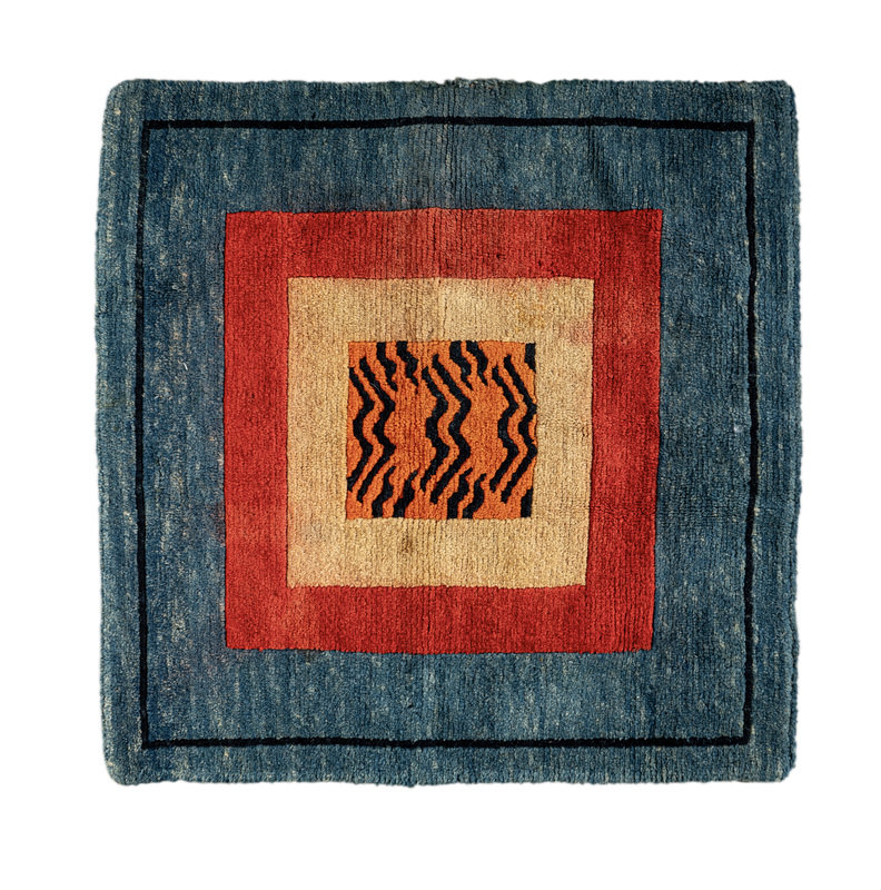 each of square shape, the cloth worked of various triangular sample tessellated into a repeating ground, the whole surrounded by a blue ground, the rug woven with a tight pile to depict a central section implying tiger skin surrounded by yellow, red, and blue borders.