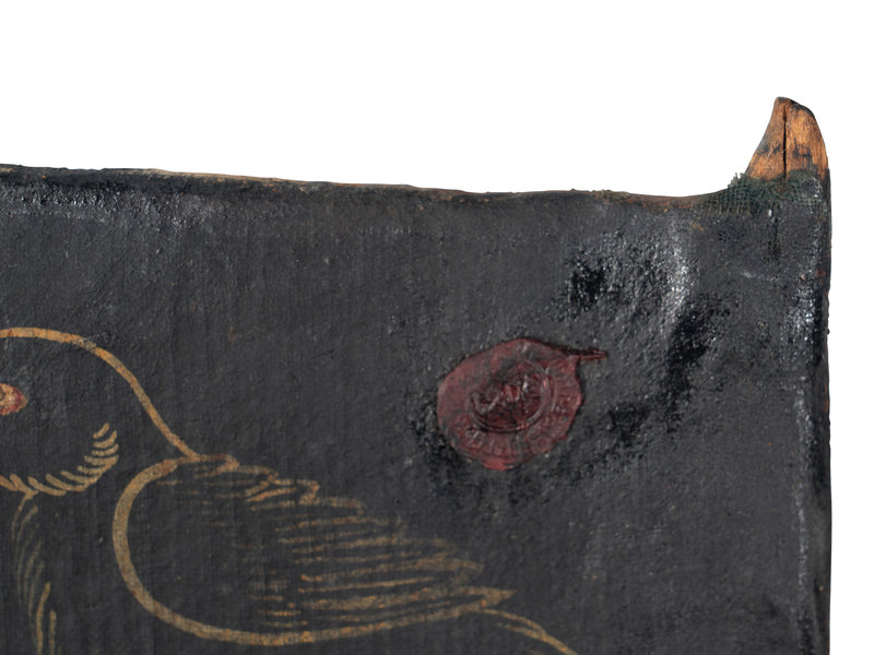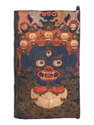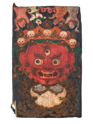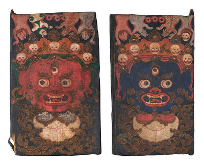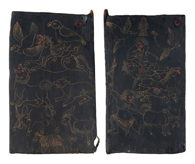 each rectangular panel painted to the front with a wrathful bodhisattva below beasts and devils, the reverse decorated with gilt highlighted birds and mythical beasts.