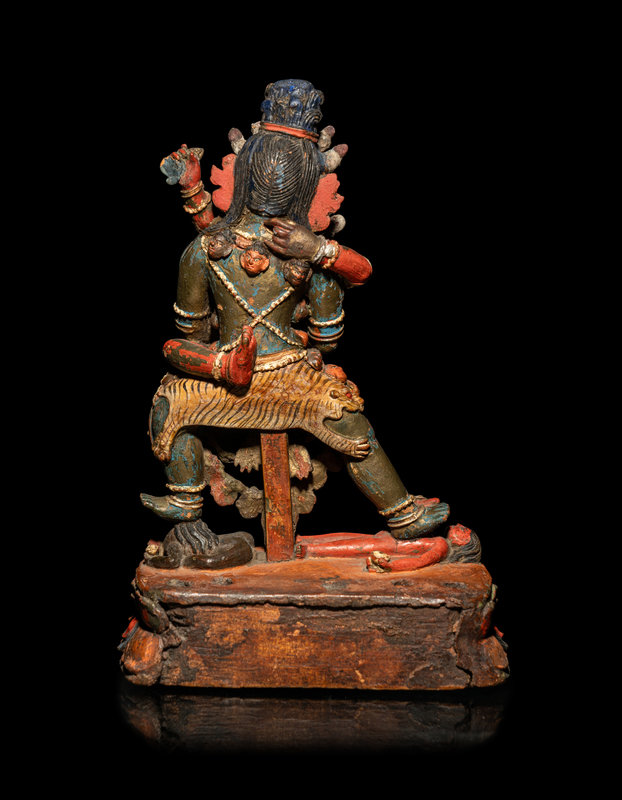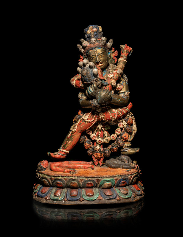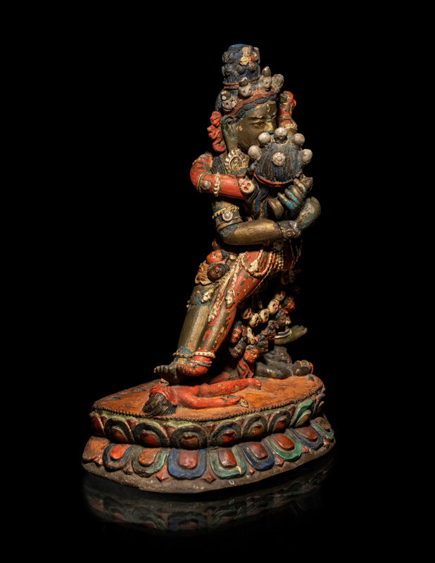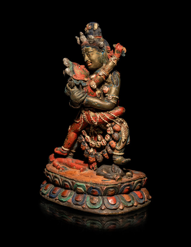 A Tibetan or Bhutanese Polychromed Wood Figure of Chakrasamvara and Consort