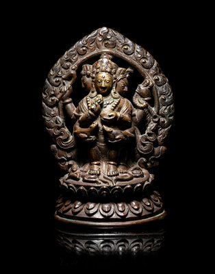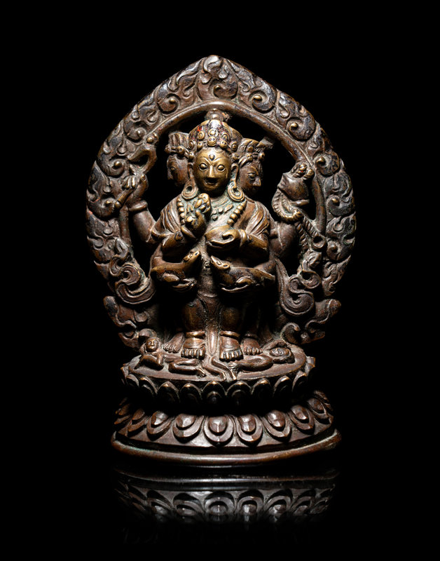 the wealth deity with three faces, a skull tiara and six arms holding various attributes including two mongooses, a vajra and a skull cup, the four legs standing on the bodies of two unfortunate figures, all raised on a double lotus base and with a flaming mandorla to the back.