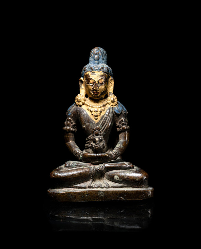 seated in lotus position on a triangular base, the Buddha of Infinite Light with hands in meditation while holding an ornate stupa, the head and neck painted gold while the hair band high chignon is blue.