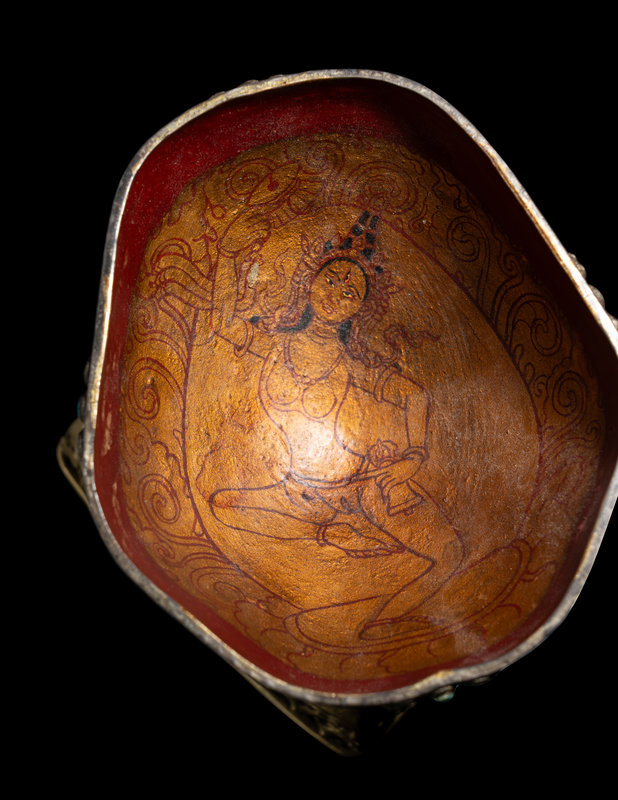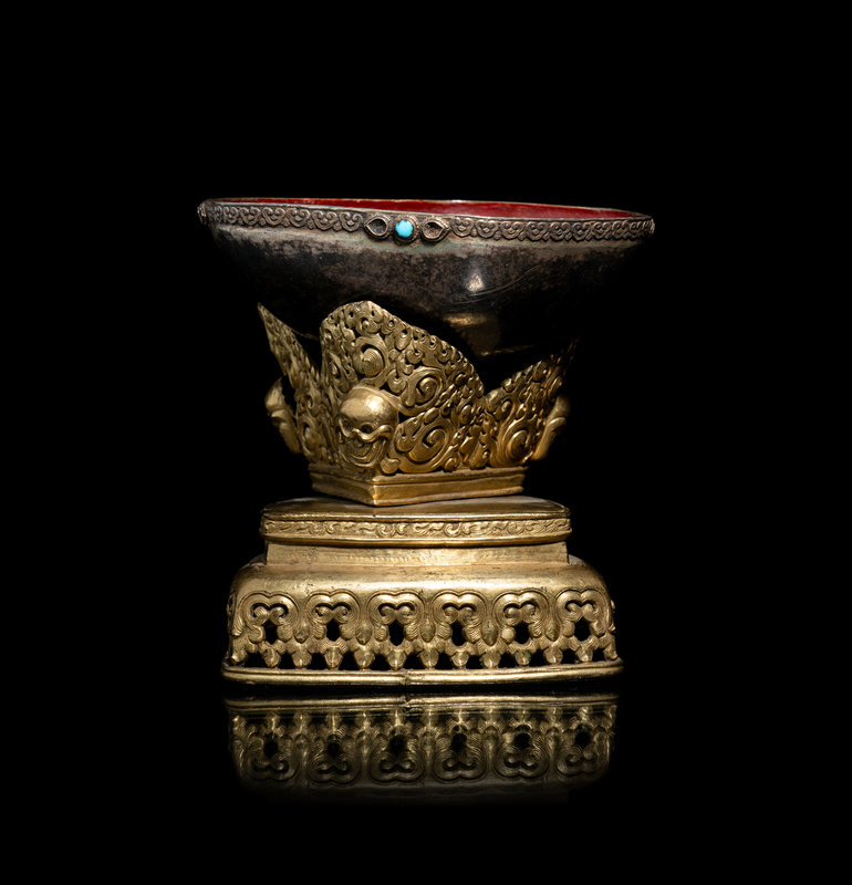 the cup realistically modelled and with a border of longevity fungus heads and inlaid turquoise beads, the interior with a red and gold lacquered image of Vajrayogini, all raised on a gilt bronze repoussé base adorned with skulls and scrolling vine.