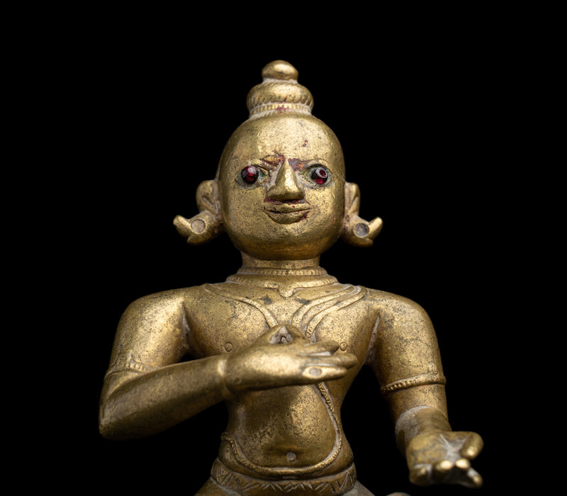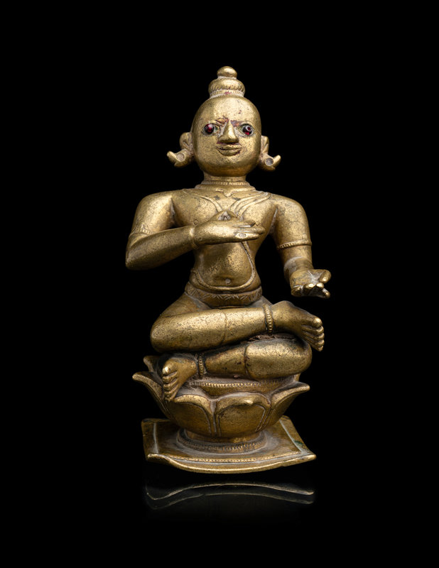 the principal Hindu deity sitting cross-legged on a raised lotus, the left hand in the gesture of charity, while the right points towards his chest, the face with a gentle smile and inlaid red eyes.