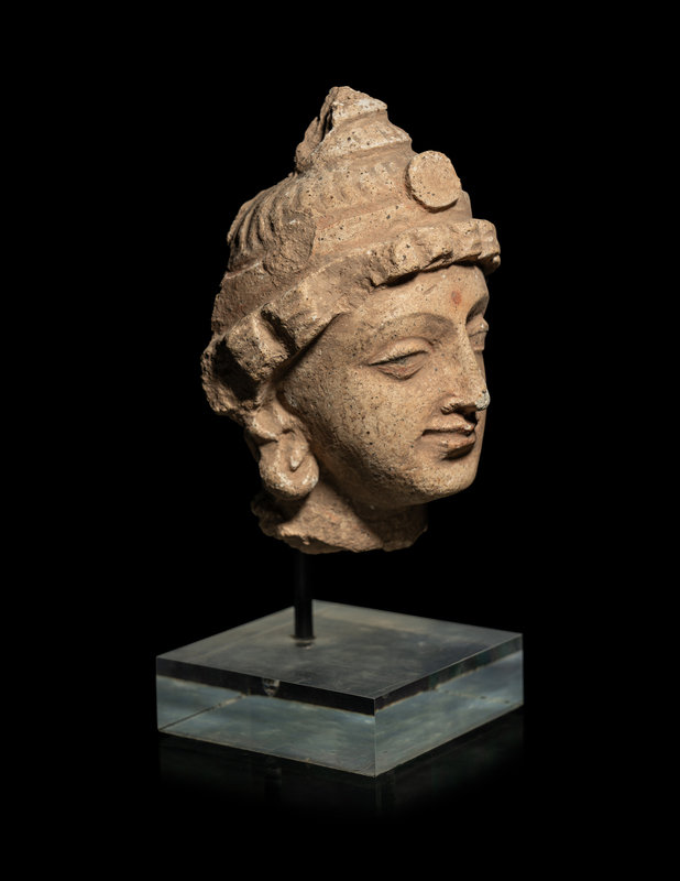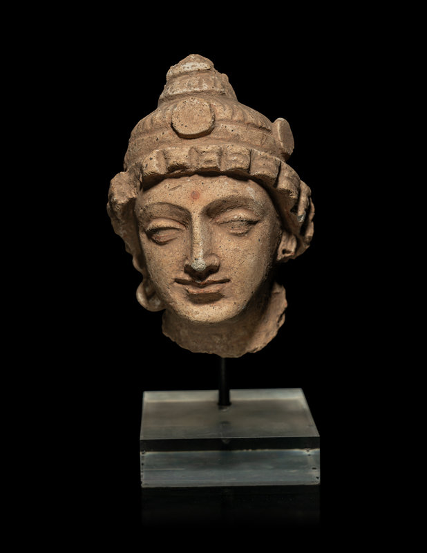 A Small Gandharan Polychromed Stucco Head of a Bodhisattva