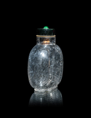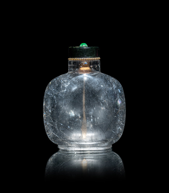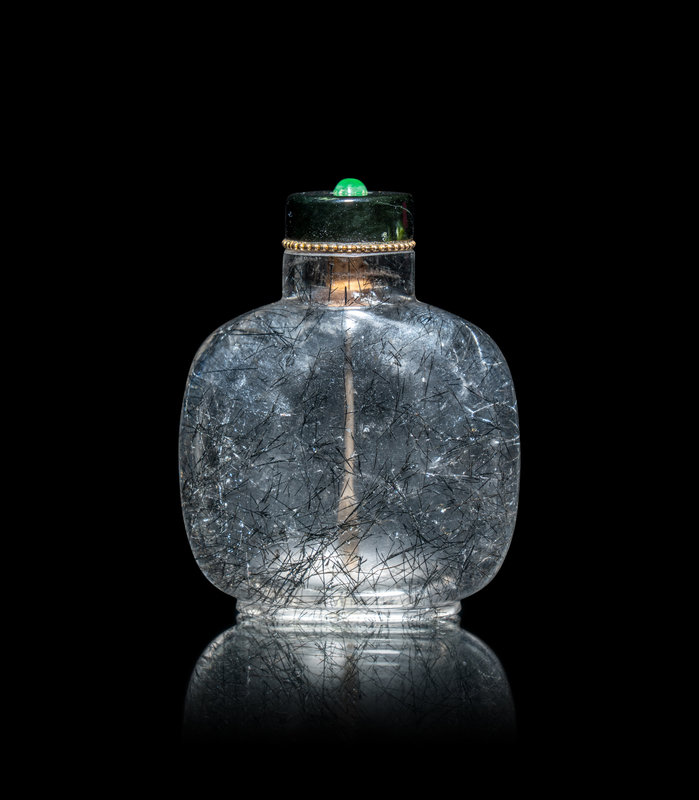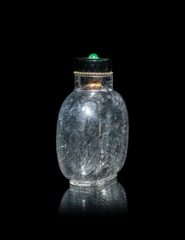 of compressed rounded rectangular form, the body densely dispersed with black rutile, black lacquered and gilt metal stopper.