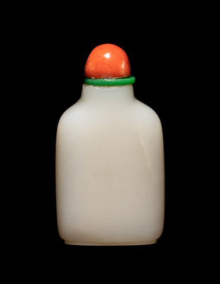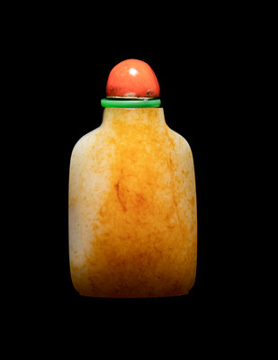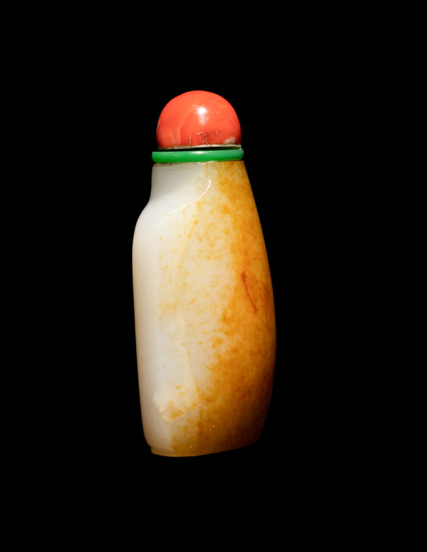 of rounded rectangular form, with one side flattened to highlight the attractive russet skin, softly polished, red coral stopper.