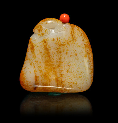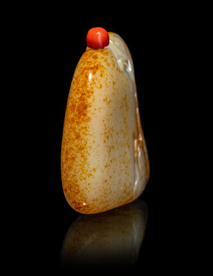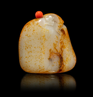A Chinese Russet and White Jade 'Monkey and Peach' Snuff Bottle