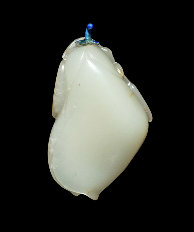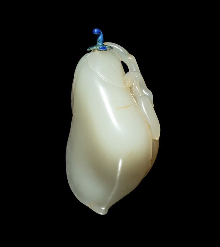 naturalistically carved to show a single elongated flower issuing from a gnarled branch with leaves, the even-colored stone with russet patches, blue enameled metal stopper.